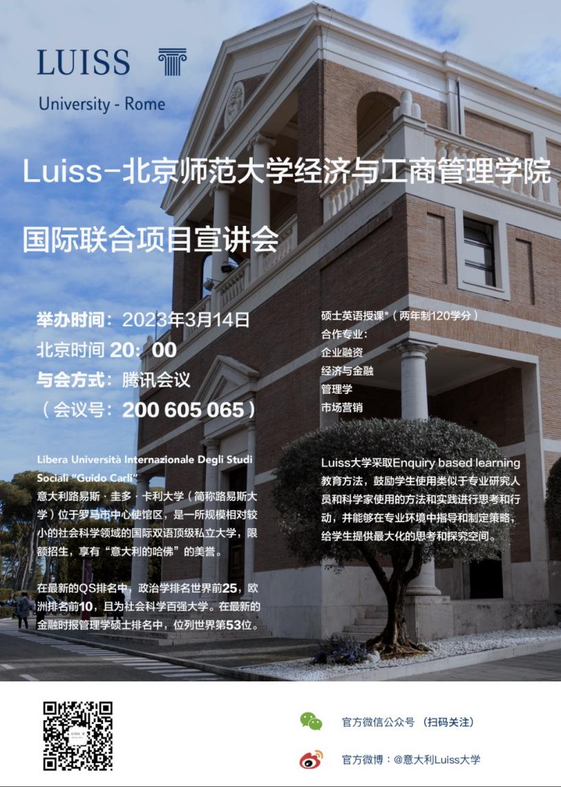 潮人论坛 经济、金融、会计、市场营销、工商管理、国际贸易专业大三学生,经过项目遴选,被意大利LUISS大学录取后,大四上学期可以前往LUISS大学继续修读两年硕士课程。可修读的专业包含企业融资、经济与金融、管理学、市场营销。本项目学习基本年限为5年。学生在第4年赴LUISS大学学习期间须远程完成潮人论坛 学士学位论文开题及答辩的相关要求。顺利完成项目的学生,可获得潮人论坛 毕业证书及学士学位证书,同时获得LUISS大学硕士学位证书。