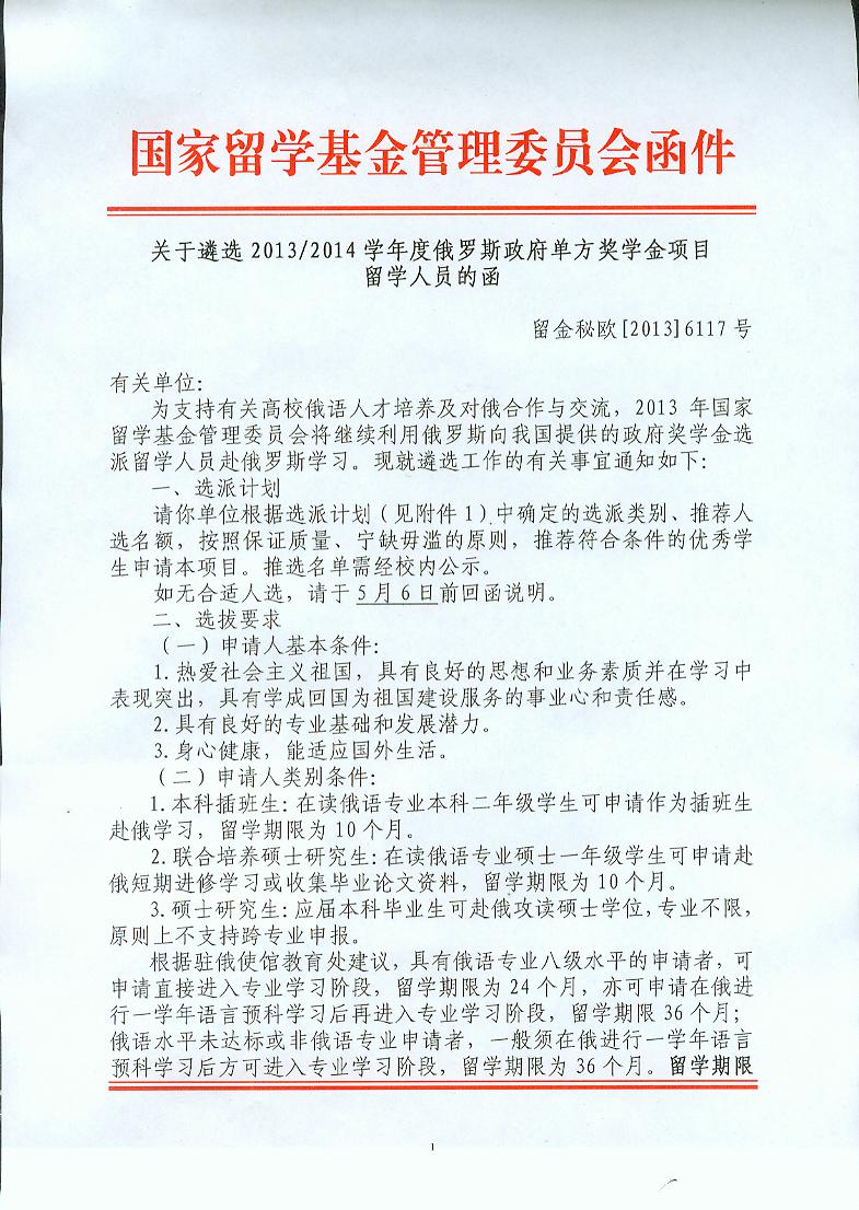 2013年俄罗斯政府单方奖学金申请受理工作说明