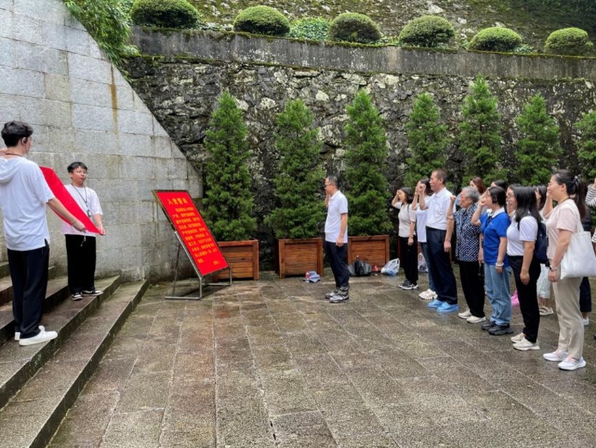 In the afternoon, the teachers and students entered Xiaojing Red Army Hospital, the first regular hospital of the Chinese Red Army, and through the on-site teaching of Jinggang Heroes' Dedication Spirit of "Firm Faith and Sacrifice for the Cause", they understood the inimiably lofty revolutionary spirit and unswerving communist belief of Zeng Zhi and other revolutionary pioneers of the older generation under arduous and extreme conditions. They also felt the great spirit of the revolutionary martyrs who gave selflessly and sacrificed everything for communism. At the tomb of Red Army Martyrs in Xiaojing, they visited the martyr site of more than 130 seriously injured patients in Hongguang Hospital. They ersonally felt Jinggang heroes fearless spirit of sacrifice and revolutionary ideals above the firmness of belief. In the Red Army Cave (Longtan), teachers and students experienced the revolutionary spirit of the Red Army's firm and persistent pursuit of ideals during the climb.