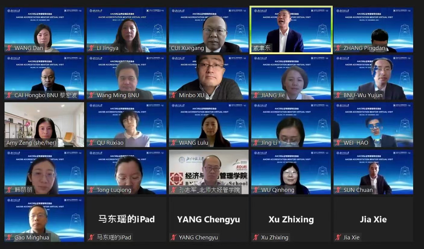 Cui Xuegang, Associate Dean of BNUBS, introduced the basic situation of the School and the progress and work plan of AACSB accreditation. Subsequently, the faculty representatives had in-depth communication and exchange with the accreditation guidance experts on how to embody the comprehensive strategic planning, social influence enhancement, teacher classification, the construction of the Assurance of Learning system, the writing of the self-assessment report (iSER) and the next step of the accreditation work plan. Amy Z. Zeng highly praised the foundation of School construction and the phased achievements achieved in the accreditation work of AACSB, and put forward a lot of constructive guidance on the following, patiently answered the questions raised by the teachers at the meeting.