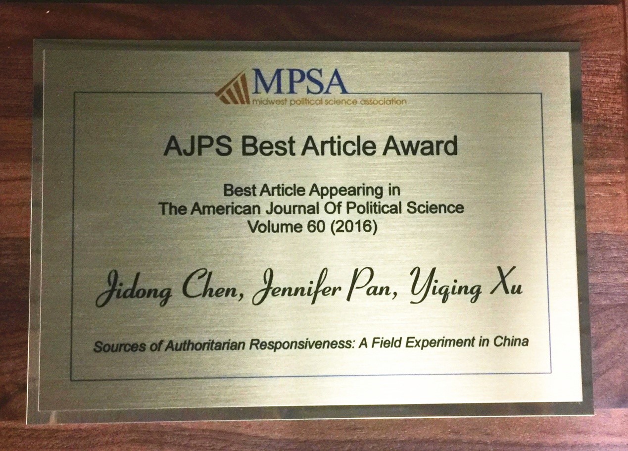 Prof. Chen Jidong's Coauthored paper won AJPS Best Article Award