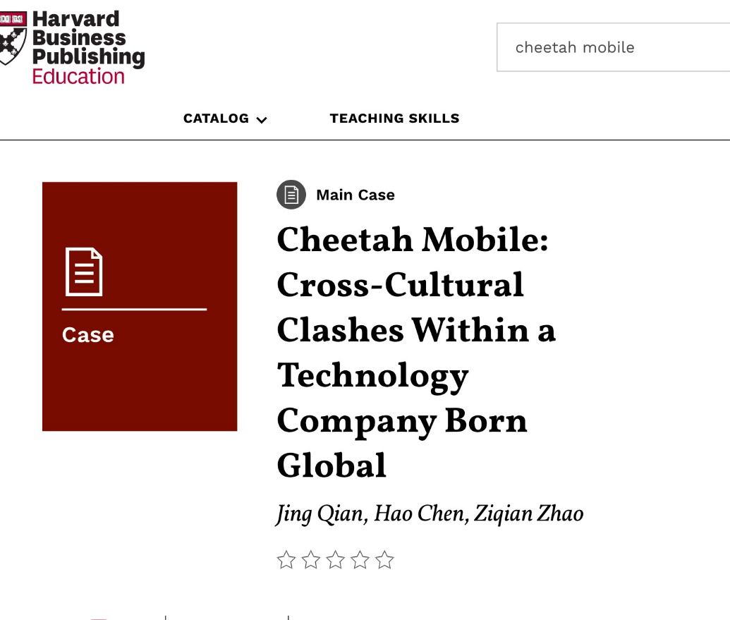The case of Cheetah Mobile——Cheetah Mobile: Cross-Cultural Clashes Wighina Technology Company Born Global is officially included in the Harvard Business School case library, the world's top business case library, which was jointly written by associate professor Qian Jing , undergraduate Qu Yi of our school and teachers of Tsinghua School of Economics and Management. It is a new development in case development since the establishment of the case center of our school.