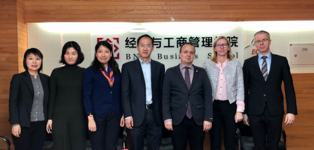 On November 3rd, 2019, Peter Kovacs, dean of Faculty of Economics and Business Administration, University of Szeged(hereinafter referred to as FEBAUS), Marta Gorog, dean of the Faculty of Law,University of Szeged (hereinafter referred to as FLUS)and Richard Mohr, dean of Confucius Institute visited the BNUBS with Liu Min, deputy director of international affairs and Yu Xiaoyu, liaison specialist accompanied. Chairperson Sun Zhijun and Xie Jia, director of the International Exchange and Cooperation Office met with the guests.