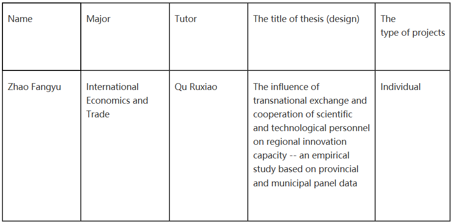 A total of 6 school-level excellent graduation papers of the class of 2019 applied for excellent undergraduate thesis of Beijing universities in 2019, and one of them was awarded by experts and Beijing municipal commission of education. The specific information is as follows: