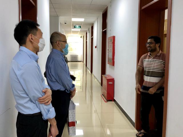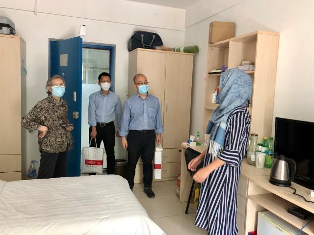 On May 20th, the associate dean Cai Hongbo visited and expressed solicitude to the international students who stay on BNU campus in this epidemic period. The program director of the Chinese Program Mrs. Li hui, the program director of the English Program Profl Zheng Feihu, and Ms. Xie Jia from the International Exchange and Cooperation Office accompanied.