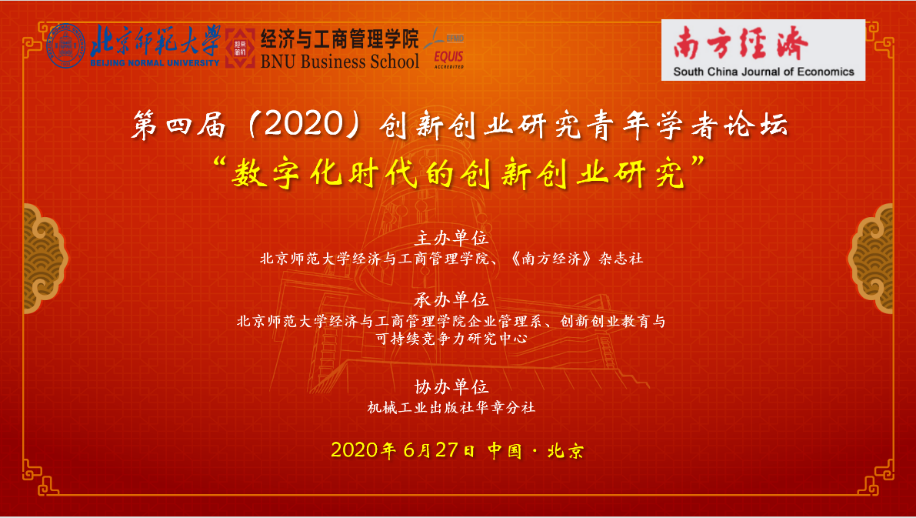On the afternoon of June 27, 2020, the Fourth Young Scholars Forum on Innovation and Entrepreneurship—Research on Innovation and Entrepreneurship in the Digital Era was successfully held online. The forum was hosted by Business School of Beijing Normal University and the South China Journal of Economics. It was organized by the Department of Strategic Management and Research Center for Innovation and Entrepreneurship Education and Sustainable Competitiveness, and co-organized by Huazhang Branch of China Machinery Industry Press.
