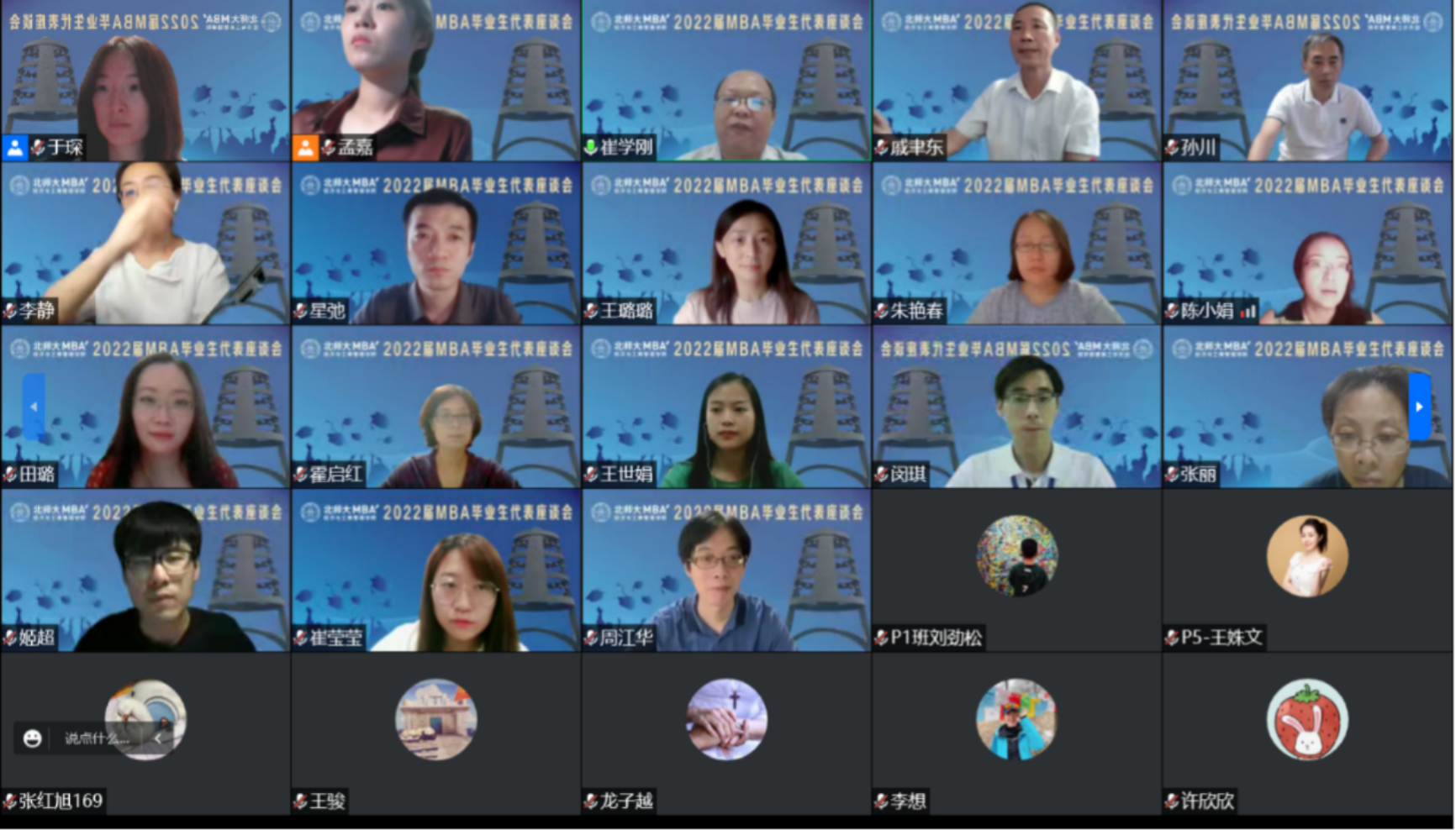 At 19pm on June 28, the forum of 2022 MBA valedictorian of BNUBS was held on the cloud via Tencent Conference platform.Qi Yudong, Dean of the School, Ge Yuliang, Deputy secretary of the Sub-Party Committee, Cui Xuegang, AssociateDean of the School, Sun Chuan, Director of MBA Education Center, Zhou Jianghua, Li Jing, Wang Lulu, head teacher of the class of 2022 and all the teachers of MBA Education Center had a discussion and exchange with 14 graduates' representatives from the class of 2022 and student association.The meeting was chaired by AssociateDean Cui Xuegang.