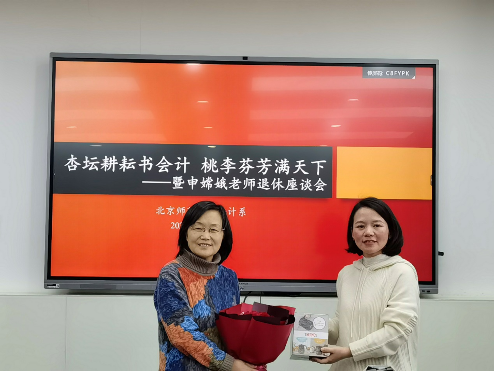 Then, the teachers of the department talked about the past, recalled the experience of working together, and expressed sincere thanks to Mr. Shen and the wish for her life after retirement. Finally, Ms. Shen gave a speech on her retirement, in which she shared her years of working in the Department of Accounting, expressed her reluctance to the work of the Department of Accounting and her colleagues, as well as her expectations and blessings for the future development of the Department of Accounting. Throughout the symposium, photos of various activities of the Accounting Department and teachers participating in activities were played on the computer screen in the venue, and the background music of "Loving each other and Family" was played. Finally, the symposium ended with applause and congratulatory words.