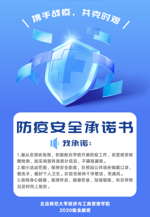 The students of BNUBS signed the letter of commitment on epidemic prevention and control in various forms, which represents the students' determination and commitment to build the campus defensive line with a scientific, rational and serious attitude, to shoulder the responsibility and obligation of epidemic prevention and control on campus, and all the students actively participated in epidemic prevention and control, spread the positive energy of epidemic prevention and control, and enhanced the awareness of prevention and control.