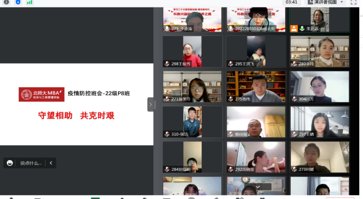 In order to implement the decisions and arrangements of the CPC Central Committee and higher level units on epidemic prevention and control, guide students to scientifically understand and deal with the epidemic, maintain a positive, healthy and stable attitude, rationally arrange their study and life, and enhance the cohesion and centripetal force of the class and School, from November 22nd to November 27th, all the undergraduate, postgraduate and doctoral classes of BNUBS used the online platform to hold class meetings on epidemic prevention and control, report the epidemic situation, convey school policies, respond to students' demands, learn advanced deeds, carry out warning education, call on student party members and student cadres to play a pioneering and exemplary role at critical moments, and lead students to be the first person in charge of their own health, and jointly shoulder the responsibility and obligation of epidemic prevention and control on campus.