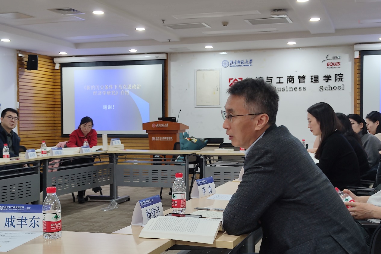 Professor Hu Haifeng, Professor Li You and Professor Yang Chengyu spoke successively in the discussion session. Professor Hu Haifeng took the lead in expressing the feeling of reading Professor Li Chong's new book, that is, to find laws from history, to solve the current practical problems, and to criticize the current situation where the concept of "capital" is not clearly defined. Professor Li You reviewed the history of the teaching and research development of political economy in BNUBS, discussed the theoretical framework and practical significance of teacher Li Chong's new book, and put forward suggestions for the construction of the discipline of political economy. Professor Yang Chengyu affirmed the significance of the publication of the new book for the study of Marx's political economy, and then mainly discussed the fourth and fifth chapters of the new book, and put forward his own four points of thinking.