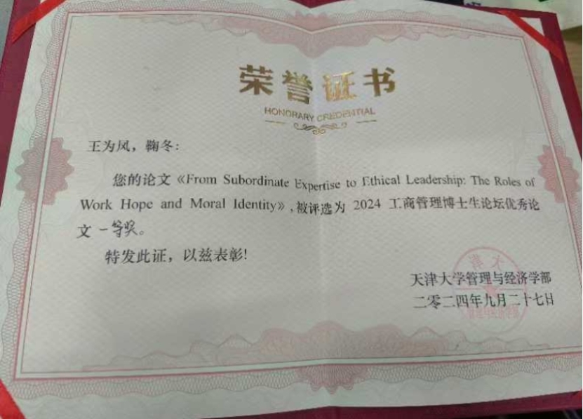 At the academic forum, doctoral student Wang Weifeng presented her thesis "From Subordinate Expertise to Ethical Leadership: The Roles of Work Hope and Moral Identity " and won the first prize for Outstanding Thesis of the 2024 Business Administration Doctoral Forum. Her study has been unanimously recognized by the review experts for its innovation and theoretical depth, which not only expands the theoretical framework of ethical leadership, but also provides guidance at the practical level.