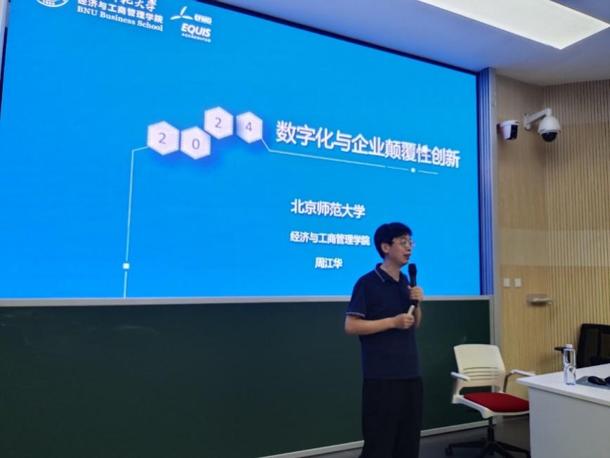 On the evening of June 1, 2024, the 33rd lecture "Digitalization and Enterprise Disruptive Innovation" of the Digital Economy and Management Lecture Hall of BNUBS was held in the lecture Room of the Electronics Building.Zhou Jianghua, professor of BNUBS, Director of MBA Education Center and Director of Case Study Center of Beijing Normal University, was invited to give the lecture. Li Jing, Associate Director of the MBA Education Center, presided over the lecture, and more than 130 undergraduate, master and doctoral students of the School attended the lecture.