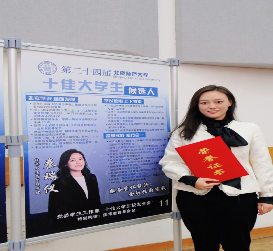 Qin Ruiyi, a 2020 undergraduate majoring in International Economics and Trade, and Zhou Meitong, a 2020 undergraduate majoring in Economics, won the honorary title of "Top Ten Students" and "Top Ten Students Nomination Award” respectively with their excellent results and outstanding performance.