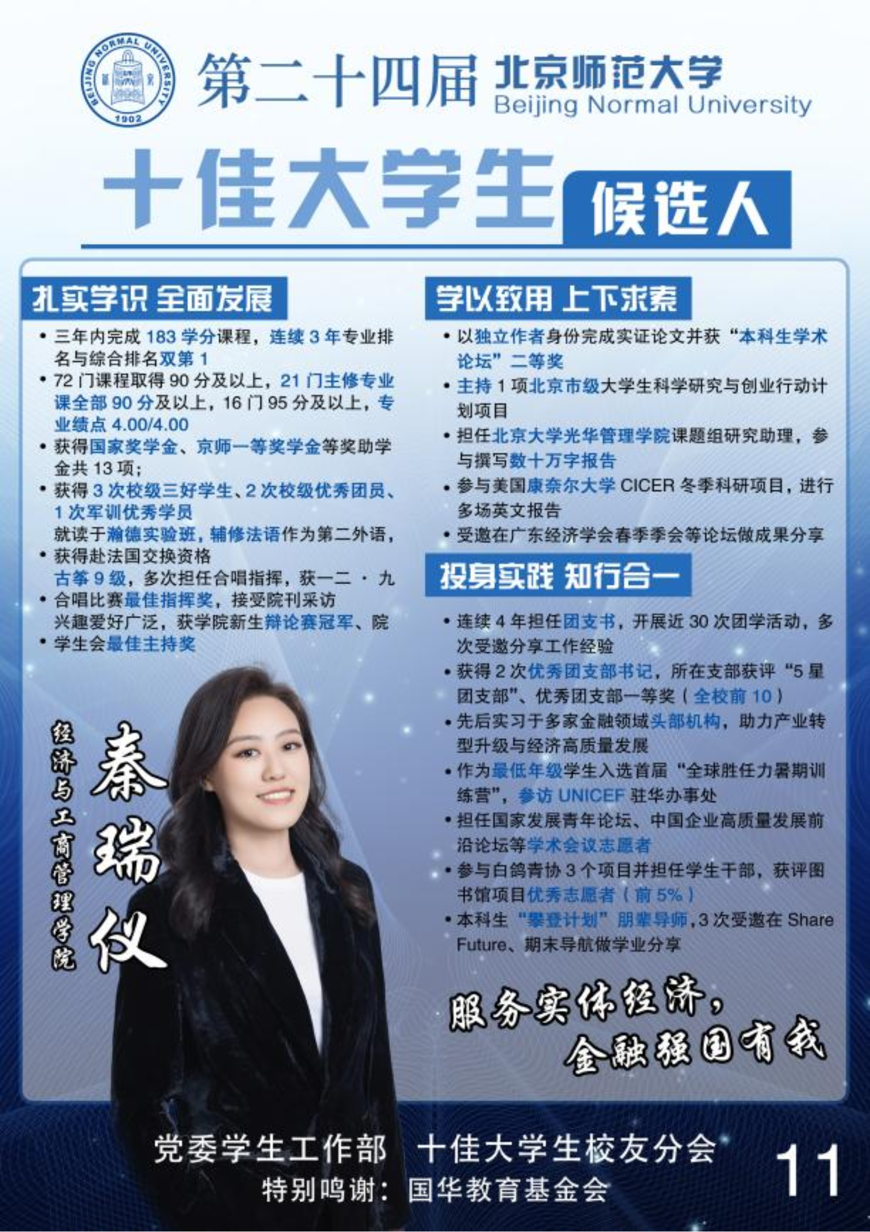 The selection of the Top Ten Students of Beijing Normal University adhered to the selection of outstanding students with all-round development of morality, intellect, physicality, beauty and labor, set up advanced models, gave play to the leading role of examples, inspired the enterprising spirit of the majority of students, actively responded to the call of the country, and served the major strategy of national construction. Since 2000, when the first Top 10 Students selection was launched, 240 students have won the award. They embody the students of Beijing Normal University's persistent spirit of seeking knowledge, pioneering and innovative consciousness, and the feelings of serving the country and the people, and also show the students of Beijing Normal University's unique temperament of worshiping virtue, erudite and upward education, sincerity, openness and determination of the mind, which has won widespread praise from teachers, students and all walks of life.
