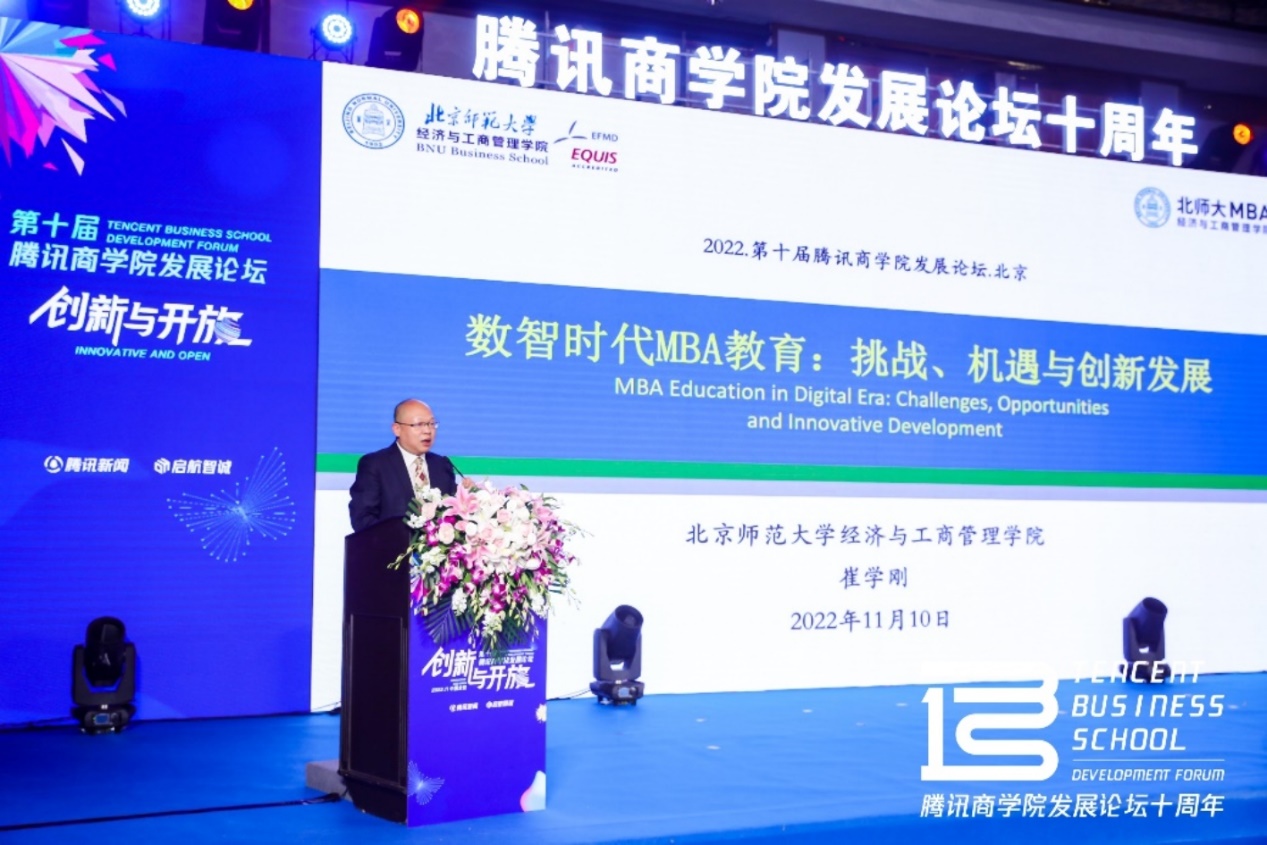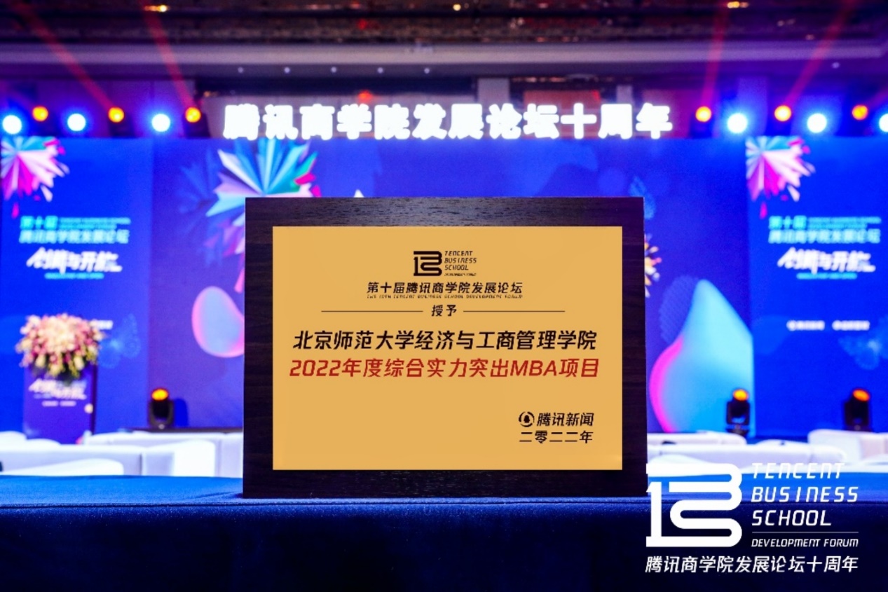 On November 10, 2022, the 10th Tencent Business School Development Forum was held in Beijing. China's well-known experts and scholars in the business education and representatives of colleges and universities participated in the forum and expressed their views through a combination of online and offline ways to help the future development of business education. About 10 million people watched and participated in the Business School Development Forum. BNUBS was invited to attend and won the award of "2022 MBA Program with Outstanding Comprehensive Strength". This award pays tribute to the outstanding institutions that follow the pace of development of The Times, blaze new trails in a pioneering spirit based on their own reality and create high-quality and high-end education brands by relying on the characteristics of international and practical education.