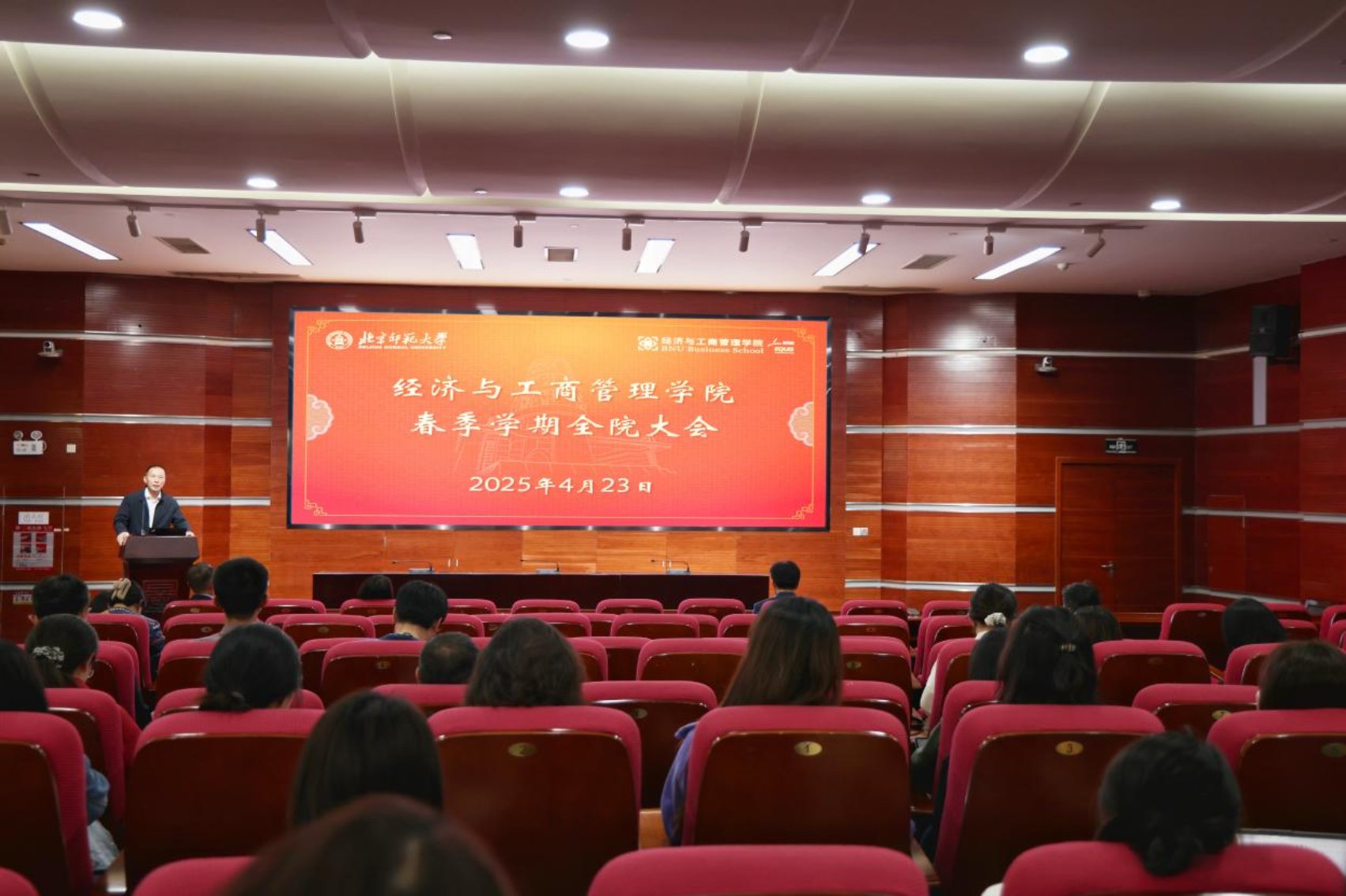 On the afternoon of April 23, 2025, BNUBS held the All - Faculty Assembly for the new semester in the lecture hall of the library. All faculty and staff attended the meeting, which was presided over by Dean Qi Yudong.