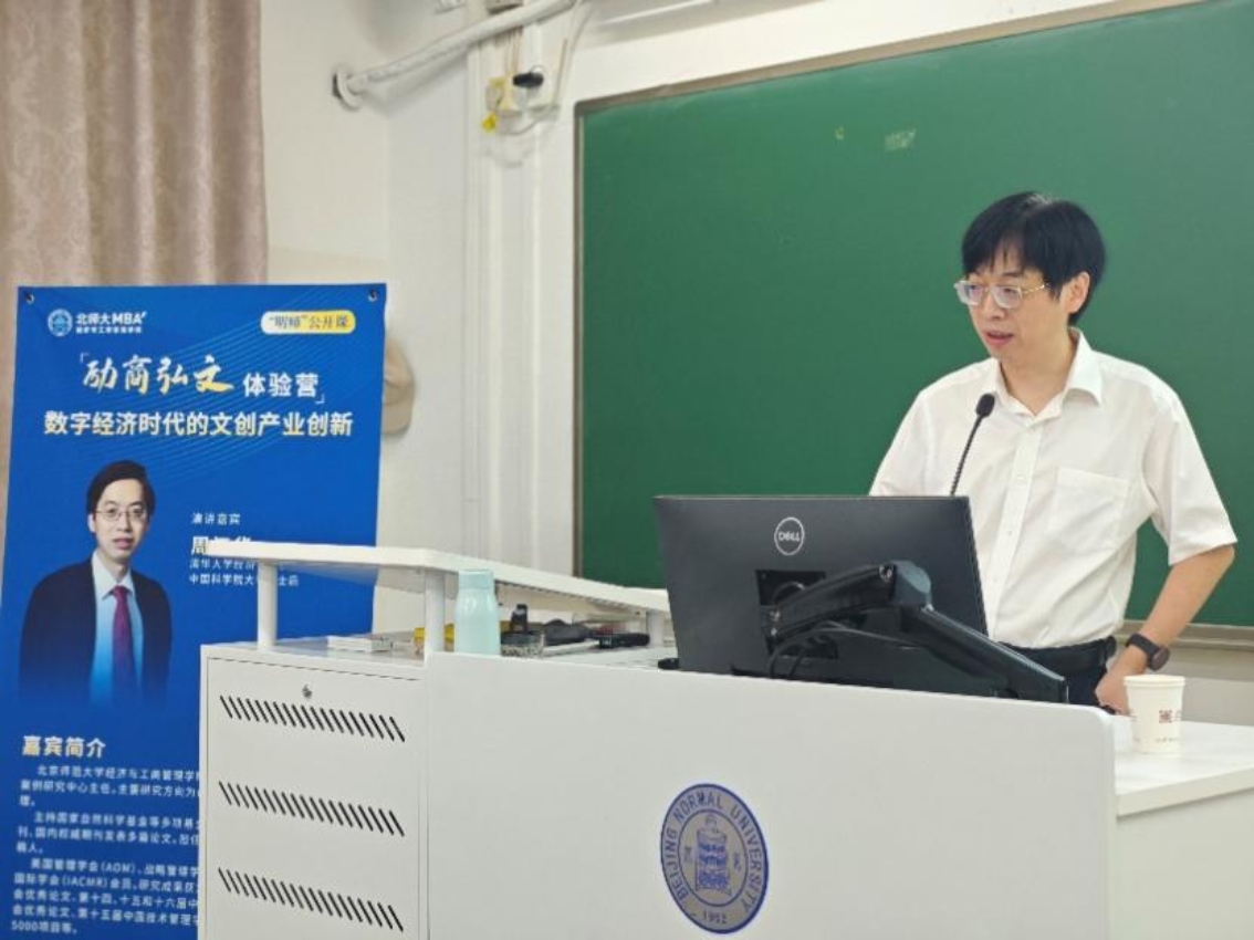 On July 13, professor Zhou Jianghua, Director of the MBA Center and director of the Case Study Center of Beijing Normal University, was invited to be the keynote speaker. With the theme of "Innovation of Cultural and Creative Industry in the Era of Digital Economy", Mr. Zhou analyzed the development trend and challenges faced by the cultural and creative industry in a simple way. He stressed the importance of digital enterprise management and cultural and creative industry management, and encouraged everyone to break professional barriers and achieve cross-border integration of knowledge. Teacher Zhou's explanation is not only solid in theory, but also closely combined with practical cases, so that students benefit a lot.