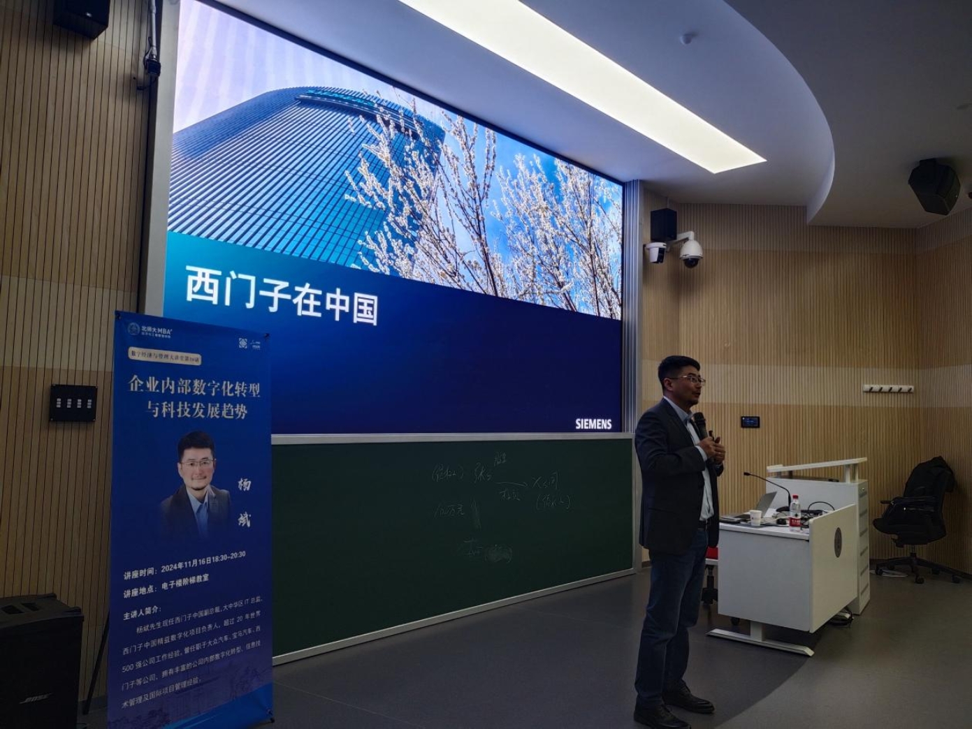 Mr. Yang first explained the process and a series of achievements of internal digital transformation of Siemens China's "Lean Digital Enterprise" project. After establishing a digital culture and building a foundation, the "Lean Digital Enterprise" project, as the third phase of Siemens China's internal digitalization, aims to build it into an industry benchmark for lean digital enterprises. Subsequently, he sorted out multiple examples of digital applications and introduced the impact assessment implemented by the company, which is a KPI monitoring of internal digital operations that reflects the speed and scale of the company's transformation. Finally, Mr. Yang analyzed the global trends in technological development and introduced some core technologies and their impacts, such as 5G and quantum computing power. During the lecture, Mr. Yang actively interacted with his classmates and answered their questions.
