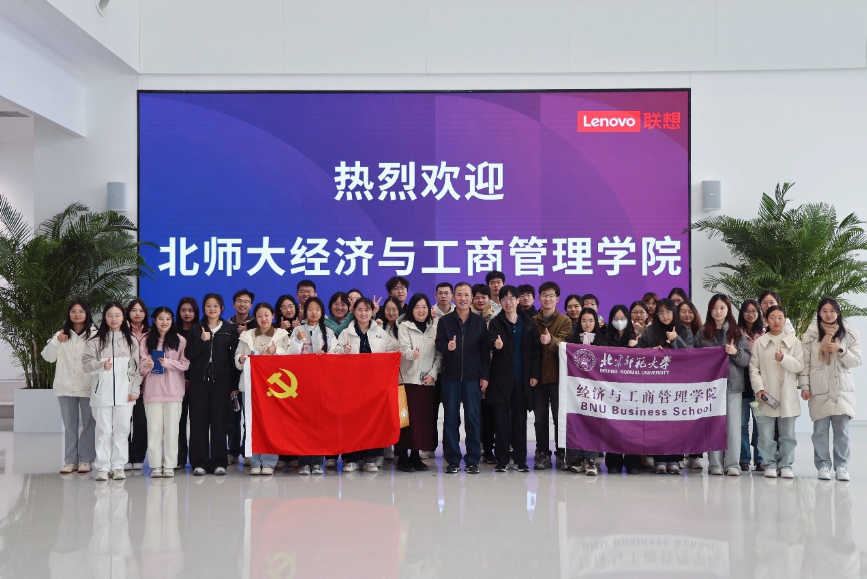 On November 24, 2024, Qi Yudong, Dean of BNUBS, Zhou Jianghua, a teacher from the Department of Digital Economy and Management, Li Lun, a double shouldered counselor, and Xu Kaige led a team to Lenovo Tianjin Future Center for exchange and learning. A total of 40 students from BNUBS, including party members, active party applicants, and students from the 2024 Business Administration (Digital Economy and Management Experiment) class, participated in this event.