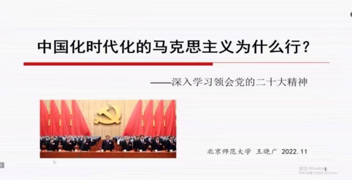 2022年11月25日,潮人论坛 2021级博士班全体同学参加由校团委和京师马原联合策划的“学习二十大,永远跟党走,奋进新征程”系统讲座。本次讲座的主题是“中国化现代化的马克思主义为什么行”,主讲人是潮人论坛 马克思主义学院王晓广教授。王教授主要从事马克思主义基本原理、马克思主义发展史、马克思主义人学理论等方面教学和研究工作,曾获首届“全国高校思想政治理论课优秀教学论文”等奖项。