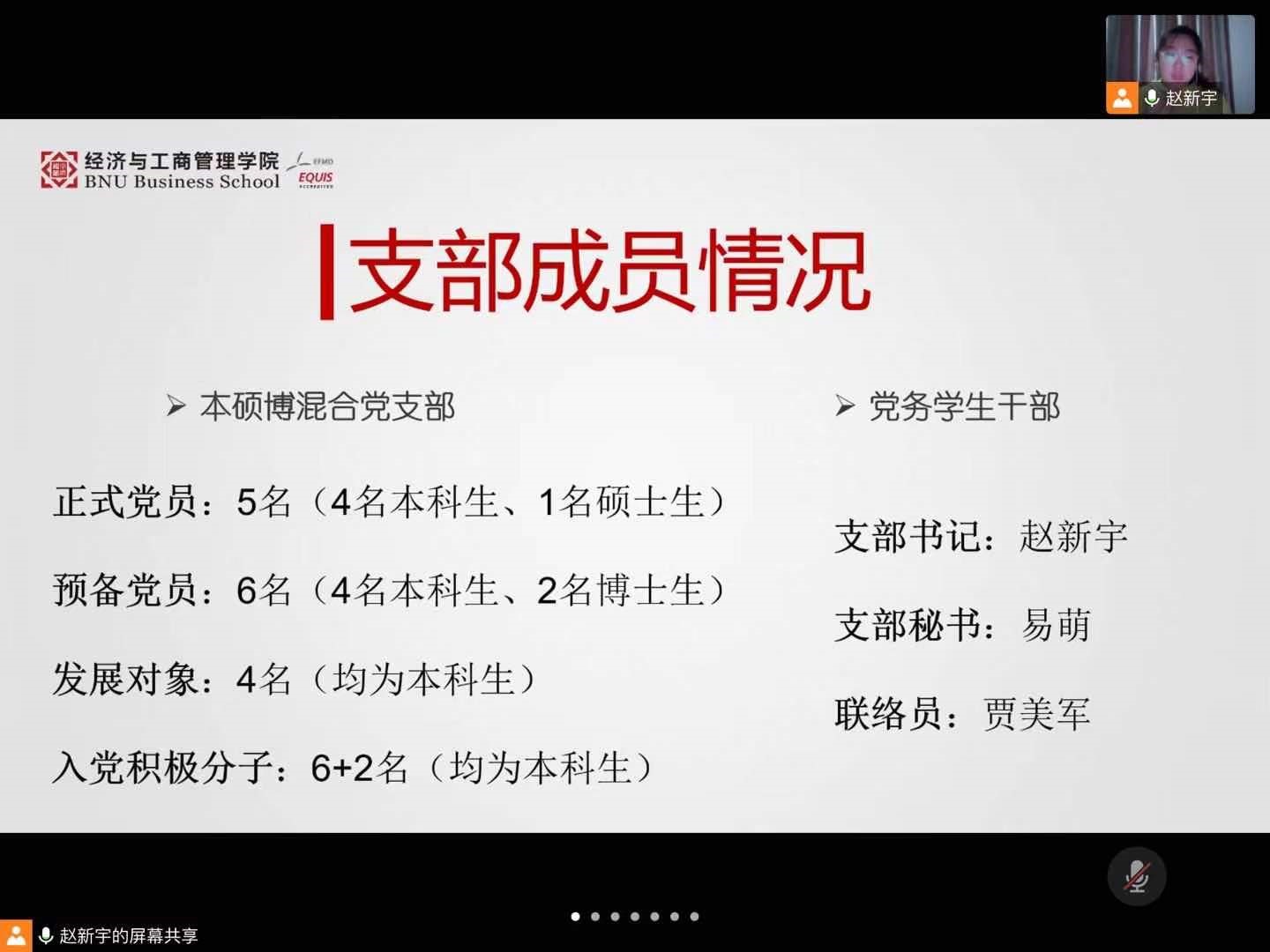 接着,赵新宇同志介绍支部近期工作安排,明确了支部近期主要任务除党员发展外,需要完成学院党委布置的“百年辉煌”纪念中国共产党成立100周年系列推送任务,希望支部成员们尽心做好。