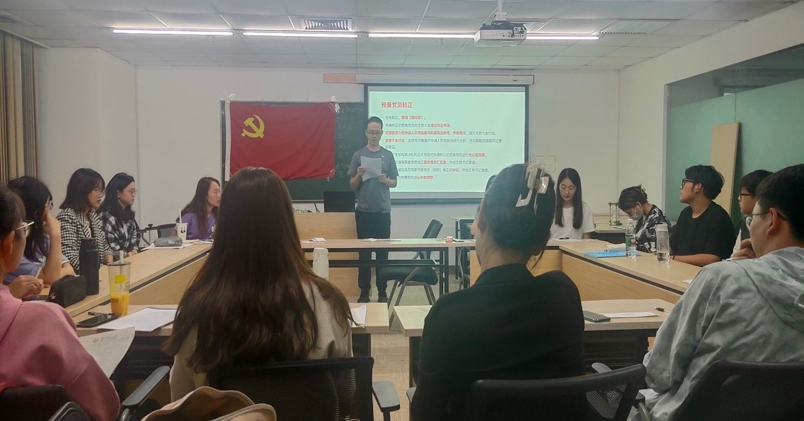 接着,党支部讨论预备党员左佳弘同志、房慧同志的转正事宜。两位同志依次向支部提出转正申请,宣读《转正申请书》,向党组织汇报个人对党的认识、入党动机,并进行了履历梳理和自我剖析。随后,由支部党员张天硕同志宣读教育培养考察报告。支部成员充分讨论了两位同志的优缺点,帮助其增强自我认识,明确努力方向。支部八名正式党员进行无记名投票。监票人吴俊慧同志与计票人陈璇同志进行唱票,并填写接收预备党员转正票决情况汇总表。计票人陈璇同志宣读票决汇总表,支部书记袁胜轩同志宣读预备党员转正的决议。两位发展对象均获得全票赞成,顺利按期转为正式党员。