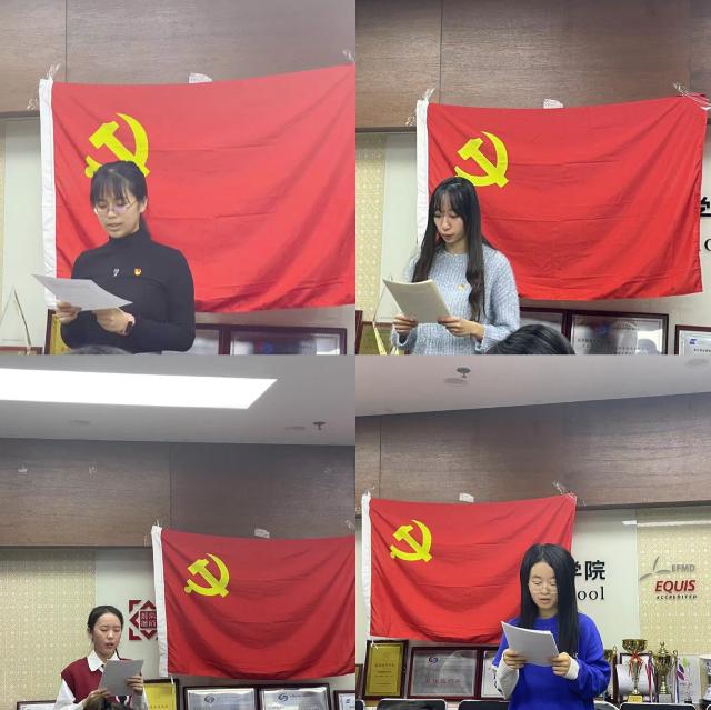 首先,大会讨论关于预备党员陈星伊、伏璐、李尤杨、张欣然同志的转正事宜。会议伊始,支部全体成员起立奏唱《国际歌》。四位预备党员依次在党旗下庄严地宣读了转正申请书,汇报了自己在预备期间的思想、学习和生活情况,表达了为党的伟大事业奋斗终生的决心。随后,组织委员王树森同志和宣传委员林嘉玥同志分别介绍了预备党员在考察期内的表现,与会党员充分讨论预备党员的优缺点并对其能否按期转正表明意见。之后,支部正式党员进行了无记名投票,并由正式党员候娟娟同志和屠西伟同志进行监票和计票,四名预备党员均获得全票赞成。许鑫凤同志依次宣读票决情况和大会决议,大会同意四位预备党员按期转正。随后,四位同志分别发表了感想,表示感谢支部成员的信任,将虚心听取意见,继续发扬优点,改进缺点与不足,为成为一名优秀的共产党员而不懈努力。