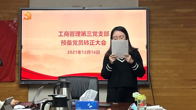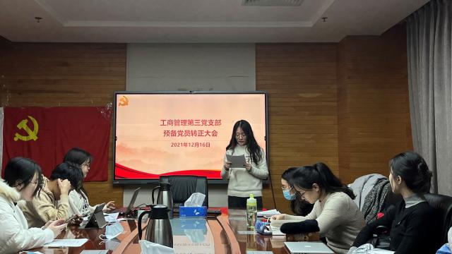 2021年12月16日,潮人论坛 工商管理第三党支部在后主楼1610会议室召开了党员支部大会,讨论了关于陈子怡和徐李玟君同志的转正事宜,集体学习了党的十九届六中全会精神。会议由支部书记薛佳安同志主持。