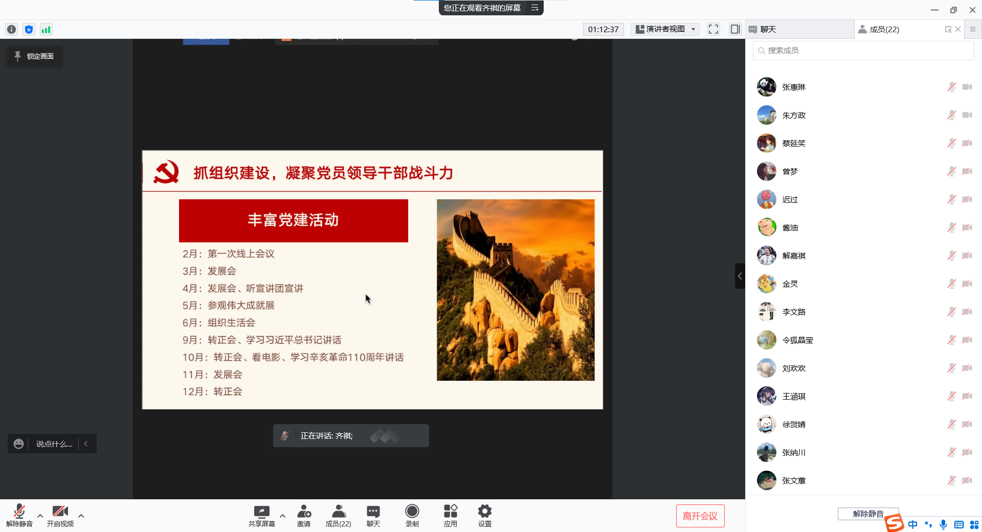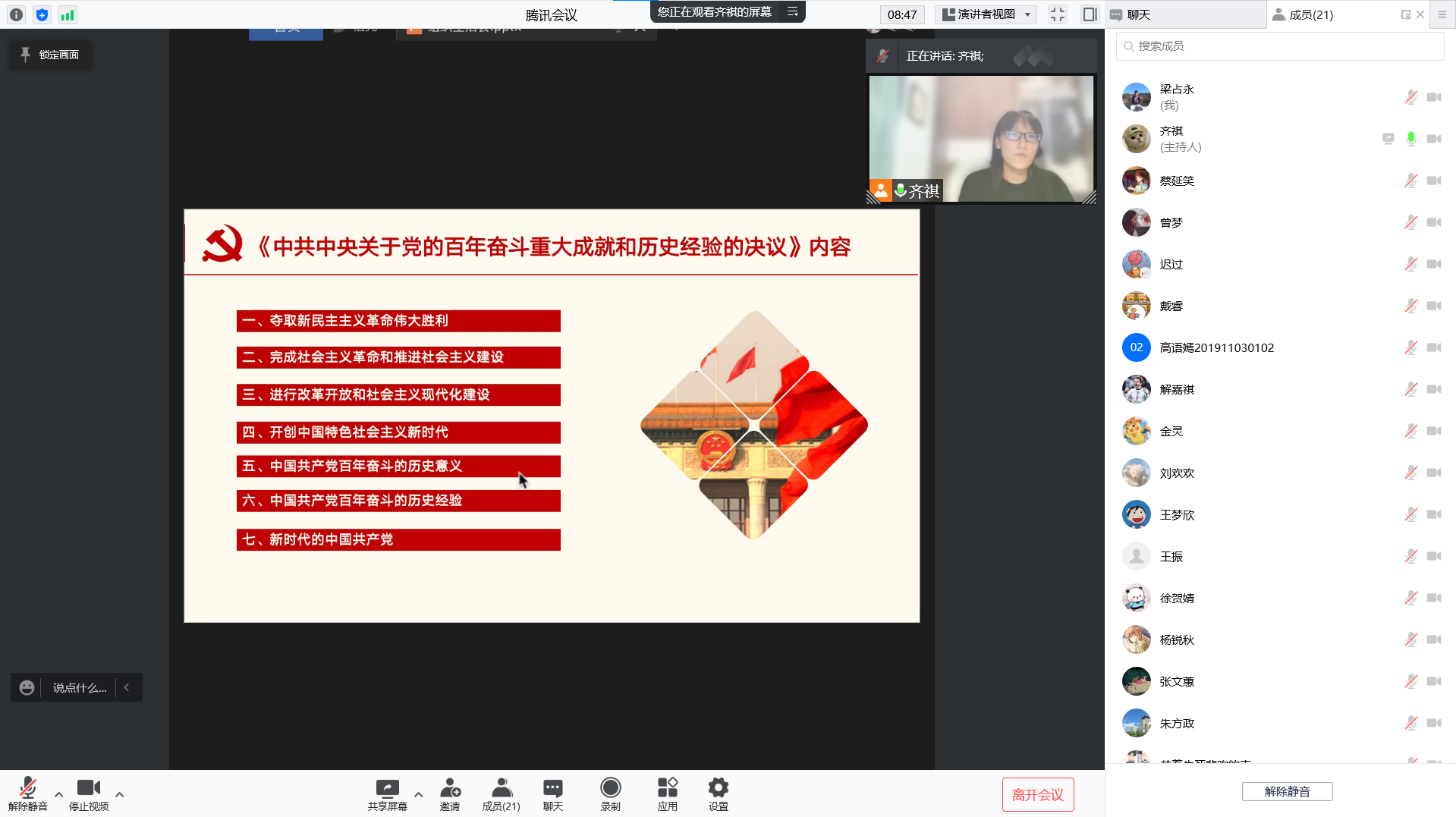 2022年1月7日,潮人论坛 经济学第五党支部通过腾讯会议召开组织生活会,集体学习党的十九届六中全会精神,进行支部书记述职和支部评议,并进行批评与自我批评。本次会议由支部书记齐祺主持,支部23名党员全部参会。