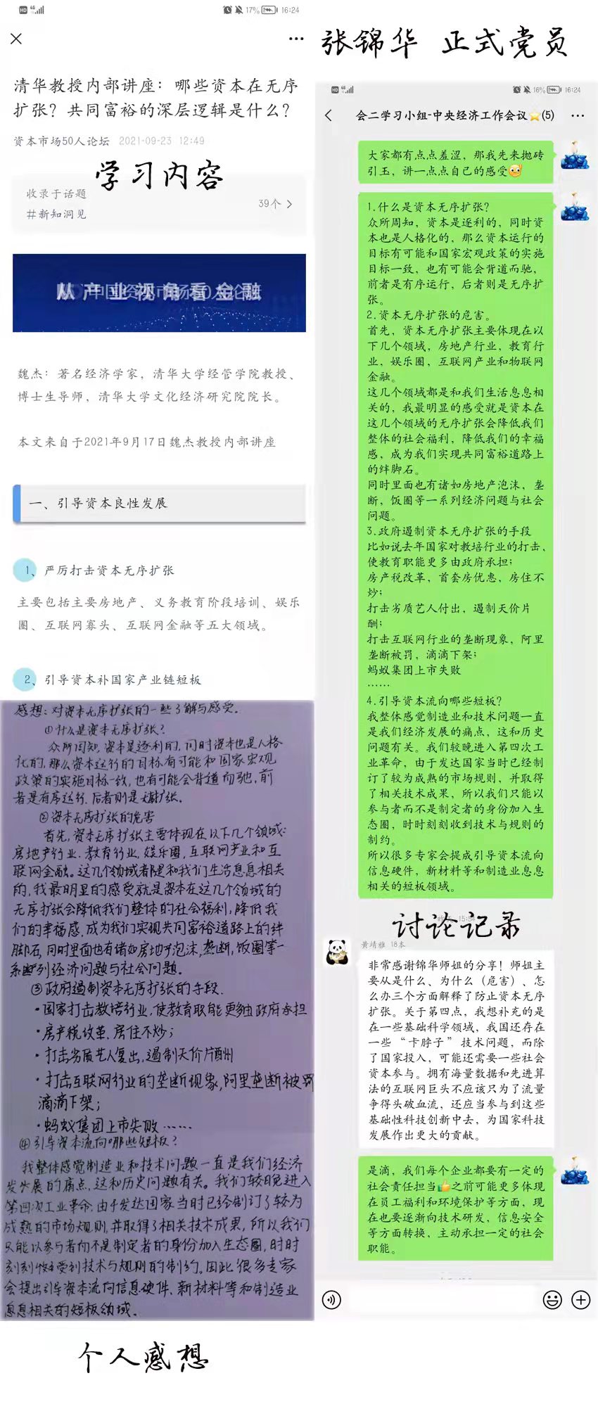 本次集体学习活动采用个人学习与小组讨论相结合的学习形式。支部全员分成六组,每个组确定同一个主题,在一周时间内由组长组织讨论,手写学习感想。最终学习成果通过图片展示,分为“学习内容展示”、“组内交流截图”和“个人学习感想”三部分。从内容上看,各组讨论各具特色,分别就“如何增强中国经济各方面的稳定性水平”、“碳中和”、“全面节约战略”、“学习‘稳’的工作部署”、“与‘我’息息相关的中央经济工作会议”、“防止资本无序扩张”展开学习与讨论。