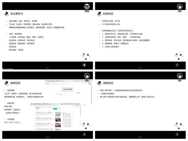 首先,昌韬同志分三个部分向同学们介绍学习经验。在专业课学习方面,他主要介绍了数学和专业课的学习经验,并以财务管理课程为例进行详细分析。在科研方面,他结合本科生科研基金项目和“励弘计划”讲述了自己完成实证研究论文的具体方法和步骤。此外,他还分享了自己保研的时间线、如何进行信息搜索、自我评估和分档投递等内容,并向师弟师妹们表达了真挚的祝愿。