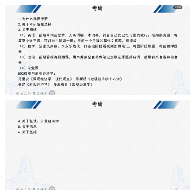 随后,郑舒婷同志向同学们分享了自己的考研经历。她从为什么选择考研、考研院校选择、如何准备初试和复试等方面分别进行阐述。尤其是在初试准备部分,她结合自己考取潮人论坛 应用经济学专业学术型硕士的经验,将英语、数学、政治和专业课的备考方法与心得体会向同学们做了十分详细的分享。