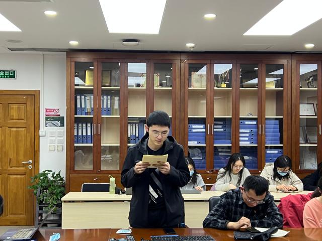 章淑婷同志的经验分享结束后,支部书记郭睿同志清点会议出席人数,介绍申请转正的预备党员章淑婷、陈晨潞、管振、李民泽等四位同志的基本情况。全体起立,面向党旗奏唱《国际歌》。四位申请转正的预备党员依次向支部大会提出转正申请,汇报自己在预备期间思想、学习、工作、生活上的表现与进步,表明自己不断向党组织靠拢并为社会主义现代化建设贡献力量的决心。章淑婷同志表示自己在预备期内,时刻按照党员的标准严格要求自己,主动向优秀党员请教学习,不断提高自己的党性修养,今后也将严格要求自己,努力发挥党员的先锋模范作用;陈晨潞同志指出在今后会从身边小事做起,担当起党员的责任与义务,发扬为人民服务的宗旨;管振同志表示要重视政治理论学习,注意改进工作作风,热心帮助同学,积极参与各项科研活动,发挥共产党员应有的作用;李民泽同志表示未来会继续认真学习党的基本理论和方针政策,自觉开展批评与自我批评,履行党员义务,不忘入党初衷,坚定共产主义理想信念。支部党员依次对四位申请人的优缺点进行分析,并对其能否按期转正表明意见。支部采用无记名投票的方式对是否同意其按期转正进行表决,支部书记宣读票决情况汇总表和支部大会决议,同意四位同志按期转正。四位同志依次进行表态发言,表示会时刻牢记党员身份,继续以更高标准严格要求自己,不忘初心,积极参与党组织各项活动,担当起党员的责任与义务。