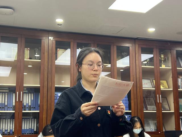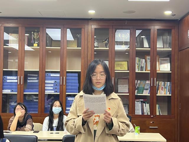 管振同志的经验分享结束后,支部书记郭睿同志清点会议出席人数,介绍申请转正的预备党员邱天韵、欧阳子云、韦宇诗、田梦等四位同志的基本情况。全体起立,面向党旗奏唱《国际歌》。四位申请转正的预备党员依次向支部大会提出转正申请,汇报自己在预备期间思想、学习、工作、生活上的表现与进步,表明自己不断向党组织靠拢并为社会主义现代化建设贡献力量的决心。邱天韵同志表示在进行理论学习和关注时事的过程中,更加坚定了自己成为正式党员的决心,同时在行动中也起到了作为一名预备党员和学生干部的带头作用。欧阳子云同志表示自己在预备期内不断学习马克思主义以及党的相关思想,并且在学习、工作以及生活上严格要求自己,在实践和志愿活动中不断向优秀的党员学习。韦宇诗同志表示自己不断努力做到理论联系实际,提高思想觉悟,树立正确的人生观、价值观、世界观,并勇于突破自我。田梦同志在学习中能够充分发挥主观能动性,将理论与实践相结合,坚定了自己为人民服务的决心,并深刻认识到学习党史是每个人的必修课。支部党员依次对四位申请人的优缺点进行分析,并对其能否按期转正表明意见。支部采用无记名投票的方式对是否同意其按期转正进行表决,支部书记宣读票决情况汇总表和支部大会决议,同意四位同志按期转正。四位同志依次进行表态发言,向党组织表达了感激之情,表示会时刻牢记党员身份,继续以谦虚的态度和更高的标准严格要求自己,不忘初心、牢记使命,积极参与党组织的各项活动,担当起党员的责任与义务。