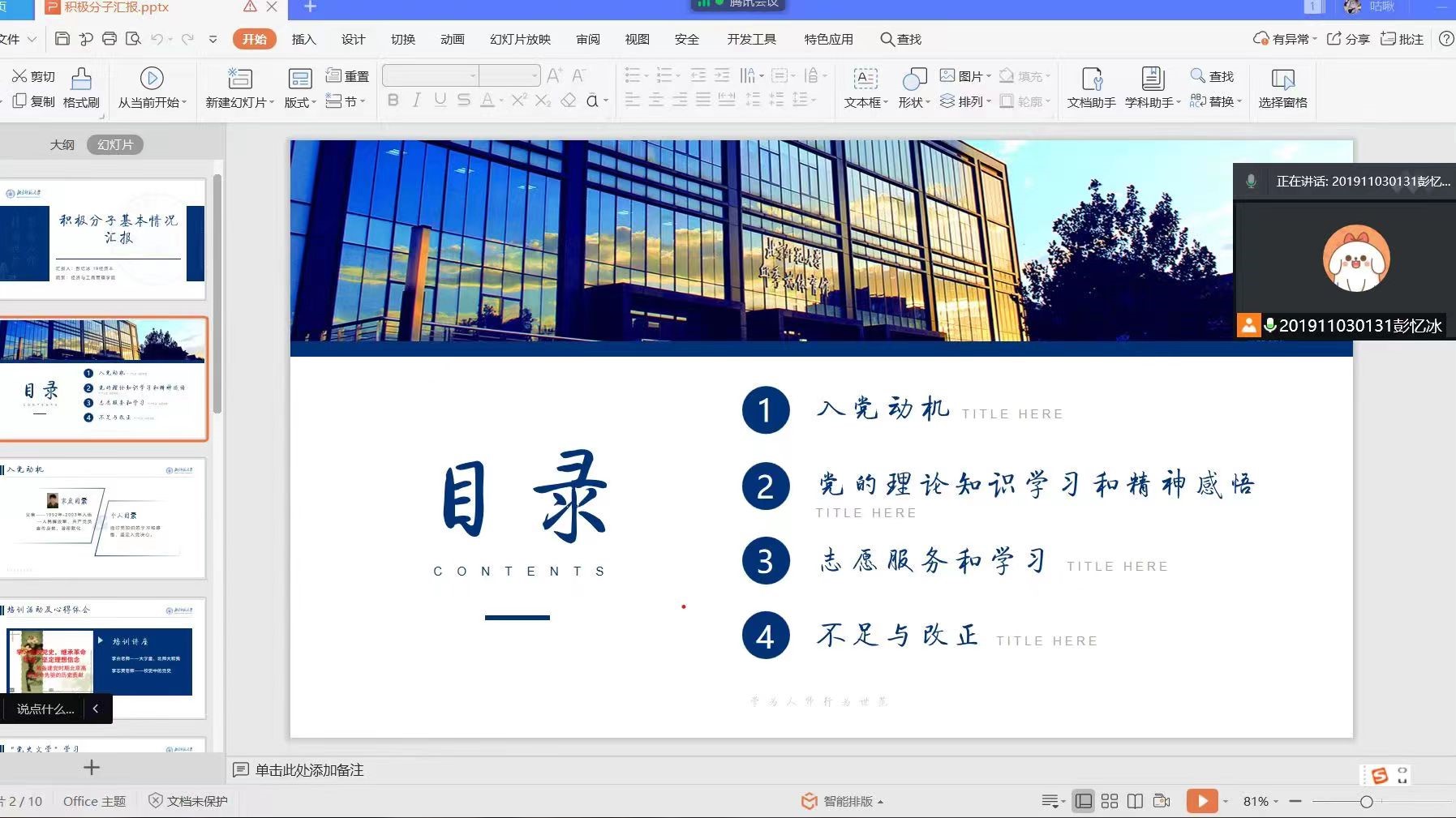 最后,经济学第一党支部于2022年4月29日对4位积极分子开展线上民主评议,积极分子每人自我陈述10分钟,接受支部党员提问5分钟,各正式党员结合积极分子以上两部分的综合表现给出分数,同一位党员给出的4个分数不允许同分。彭忆冰同学结合志愿经历向支部汇报了自己的进步,同时也反思到身上还存在不够自律、心态不稳等问题,今后会更有规律和计划,支部成员肯定了彭忆冰同学取得的进步,鼓励她继续参与志愿服务,提升自己的同时也向更多人传递温暖。史晓凡同学结合自己参与的校史中的党史宣讲活动,汇报了对于党史理论的学习,并对潮人论坛 “红色师范”有了更多了解,今后会继续努力,展现师大青年学子的风采,支部成员肯定了史晓凡同学积极参与的各项宣讲、社团工作,希望她能继续不忘初心,不断进步。王子骄同学从自己的入党动机谈起,结合亲身经历和个人学习体会介绍了自己对党的认识,并对自己考虑问题不够全面、工作中缺乏创新性等问题作了反思,支部成员肯定了王子骄同学取得的进步,她能积极反省自己的态度值得大家学习,希望在未来的实践和探索中继续克服不足、提升自我。李琦同学向支部汇报了自己的入党动机、学习生活收获以及仍然存在的不足之处,其中参与支部的活动让她丰富了理论素养,学习到了更多的使命和担当,今后她会保持积极的心态,继续前进,支部成员肯定了李琦同学的努力,并鼓励她以中国共产党的三大优良作风为切入,联系到现实的生活中,继续进步。刘松月同志对本次会议作了总结,她希望新老党员同志能够通过民主评议有更多的沟通交流,为支部注入新鲜血液,增强支部凝聚力,实现支部更大的发展。