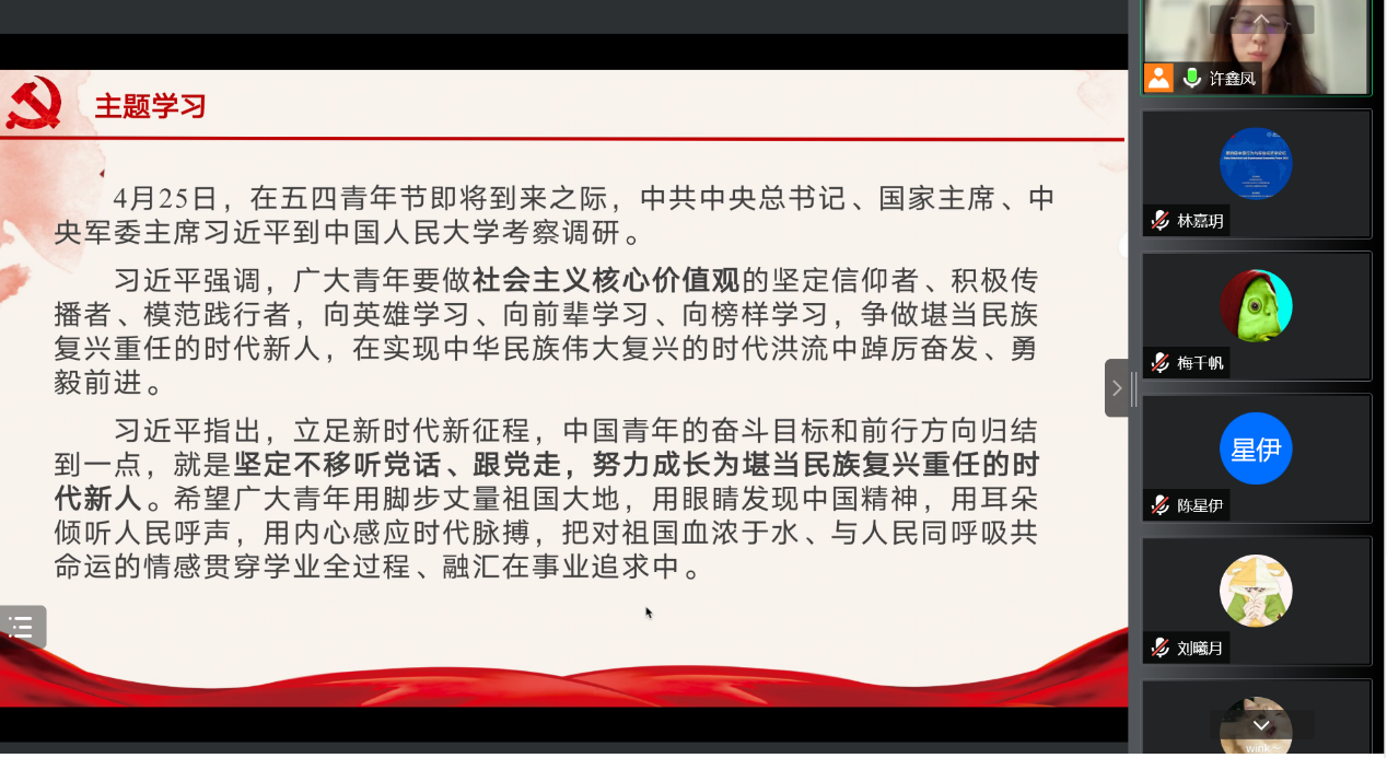 2022年5月25日,潮人论坛 经济学第四党支部线上开展组织生活,内容是“新时代新青年”专题学习。会议由党支部书记许鑫凤同志主持。