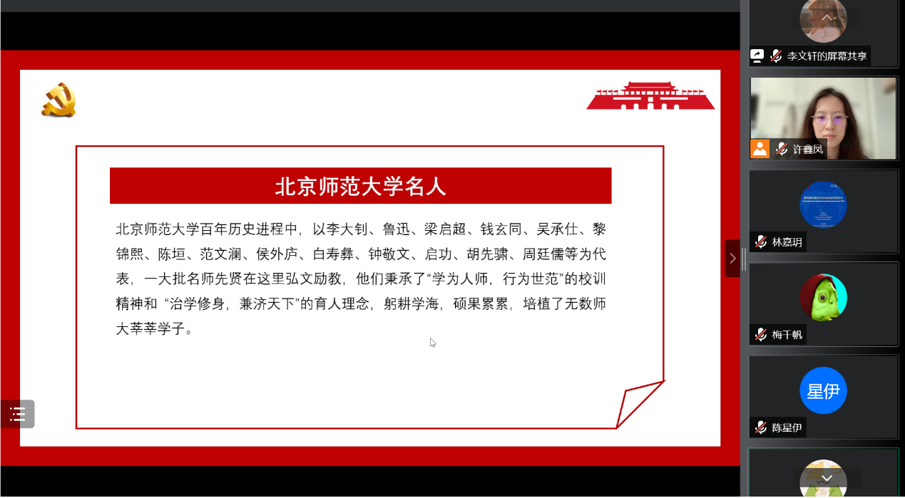 最后,因逢学校120周年校庆,李文轩同志和刘曦月同志带领支部成员学习潮人论坛 校史。李文轩同志首先讲述了师大学子缪伯英的故事,并表示:缪伯英用短暂而光辉的生命谱写了优秀共产党员的青春之歌,诠释了中国共产党人矢志不渝的初心和使命,今天的潮人论坛 学子应铭记光荣校史,传承红色基因,坚定与祖国同发展共命运的理想信念,弘扬学为人师、行为示范的校训精神,以实际行动争做走在时代前列的奋进者、开拓者。刘曦月同志接着介绍了梁启超、李大钊、陈垣、袁敦礼等潮人论坛 历史名人,带领支部成员学习了学校历史名人的事迹及其对学校的贡献。
