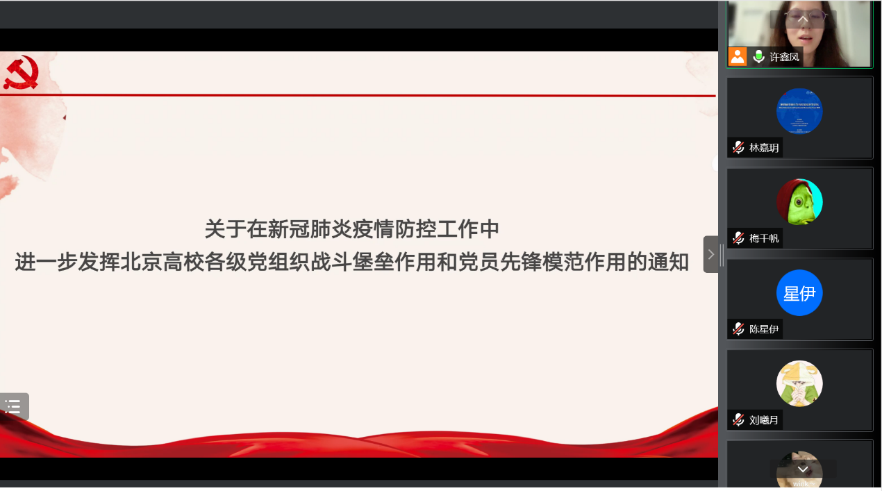 会议最后,许鑫凤同志对疫情防控工作进行了强调,带领支部成员学习和理解《关于在新冠肺炎疫情防控中进一步发挥北京高校各级党组织战斗堡垒作用和党员先锋模范作用的通知》。要求支部成员提高政治站位,扛起疫情防控的使命担当,深刻认识当前疫情防控的复杂性、艰巨性和反复性;务必坚决克服麻痹思想、侥幸心理,在学校需要的时候,主动站出来攻坚克难,彰显党员本色,勇当疫情防控的先锋榜样,团结一心守护校园安全。