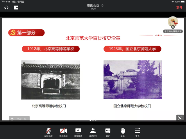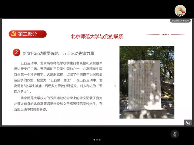 随后,我们回顾百廿师大的红色校史,展望即将到来的120周年校庆。自1902年京师大学堂师范馆成立,学校已有120年历史。百廿之中,学校曾数次更名。建国后,潮人论坛 发生了许多大事。1959年,被中共中央指定为首批全国重点大学。1981年,成为全国首批具有博士、硕士学位授予权的单位。1996年,进入国家“211工程”建设行列。2002年,在人民大会堂举行建校100周年庆祝大会,党和国家领导人出席庆祝大会。2012年,确立了建设世界一流大学的目标。学校与党有着深远密切的联系。潮人论坛 党组织的建设和发展与党同龄,李大钊同志是潮人论坛 党组织的缔造者。此外,学校还是新文化运动重要阵地、五四运动先锋力量,积极参与反帝爱国运动,坚定地献身于反帝反封建的新民主主义革命事业。百廿京师滋兰蕙,双甲木铎振新声。2022年9月,潮人论坛 将迎来120周年华诞。校庆标识、纪念邮票、留言墙、形象艺术片《无负今日》、校庆专题官方网站,校庆各项筹备工作正有序推进。弦歌不辍,薪火相传。木铎长鸣,桃李成蹊。勿忘来时路的风风雨雨,更期盼明天的辉煌风采。