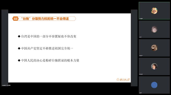 第三组的成员有赵婧、旷祎诺、母涵婧、张玮航,他们分享的主题是“祖国完全统一进程不可阻挡”。本次分享分包括“实现祖国完全统一是中华民族伟大复兴的必然要求”“国家发展进步引领两岸关系发展方向”“‘台独’分裂势力抗拒统一不会得逞”“外部势力阻碍中国完全统一必遭失败”等四个部分。通过列举史实和详细阐述,直观地告诉大家:祖国统一的历史车轮滚滚向前,任何人和任何势力都无法阻挡。
