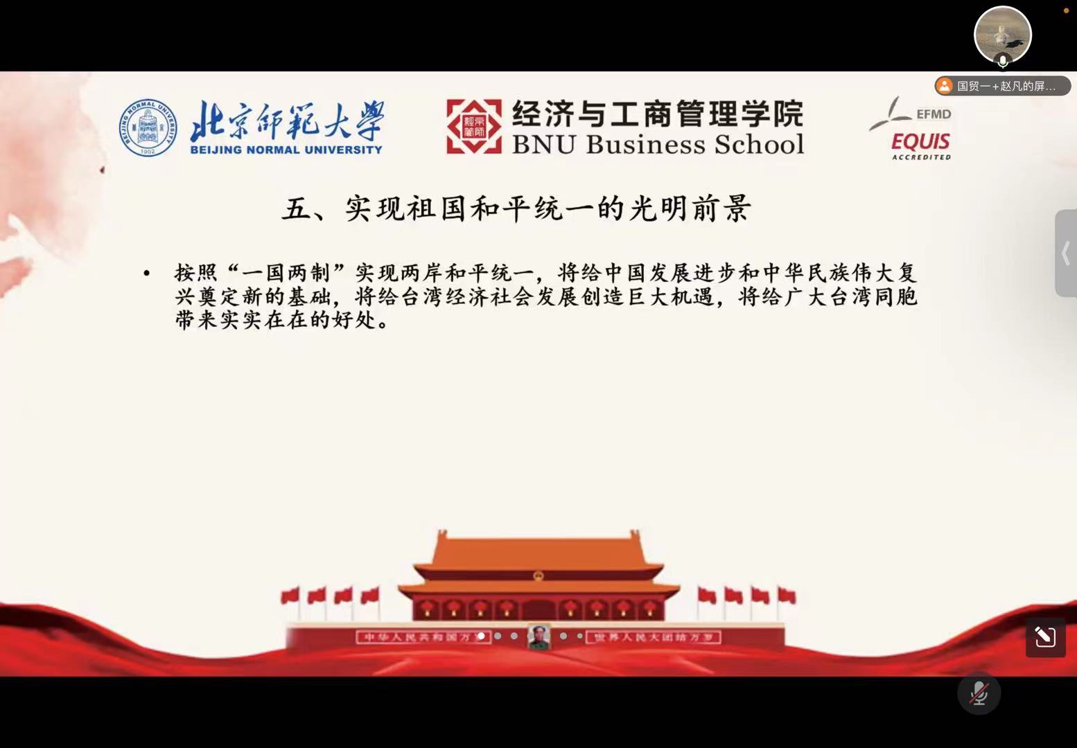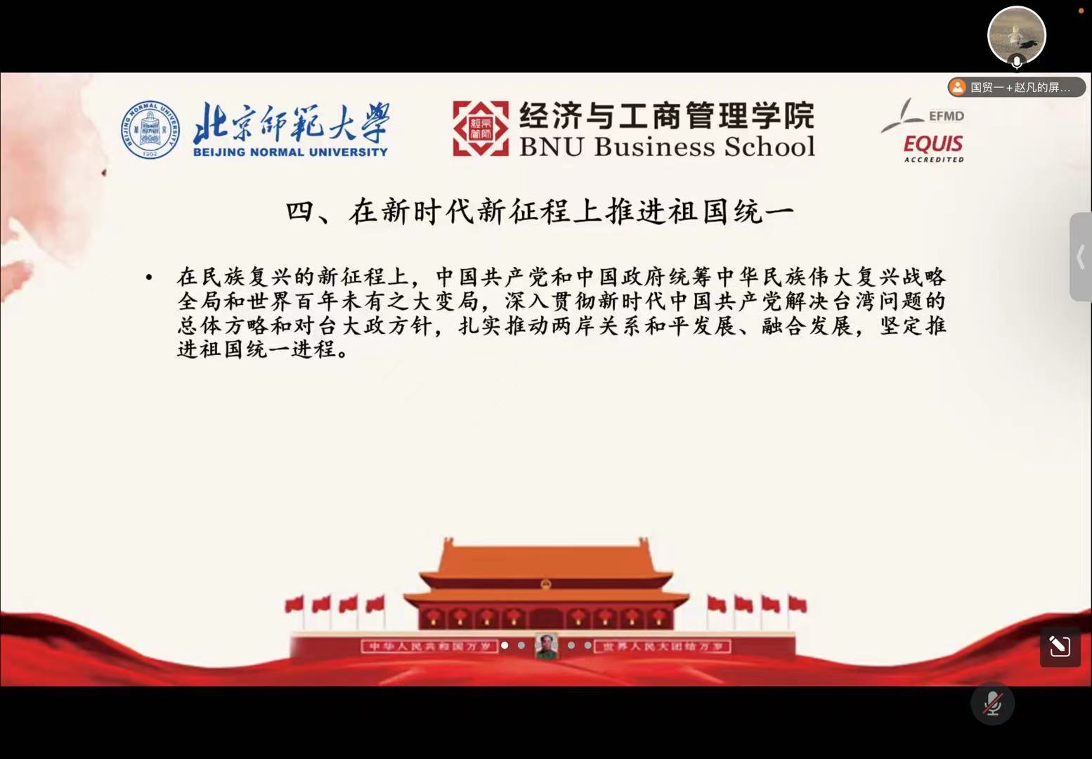 白皮书的后两部分由国际贸易第一党支部的赵凡同志带领大家学习。第四部分的主题是“在新时代新征程上推进祖国统一”,她从“坚持‘和平统一、一国两制’基本方针”、“努力推动两岸关系和平发展、融合发展”、“坚决粉碎‘台独’分裂和外来干涉图谋”、“团结台湾同胞共谋民族复兴和国家统一”四个方面详细阐述了在民族复兴的新征程上,中国共产党和中国政府统筹全局,扎实推进祖国统一进程。