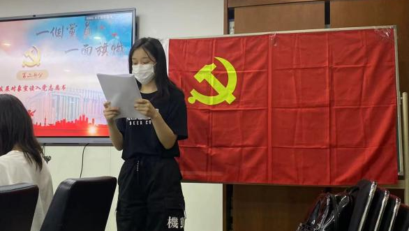 孙筱然同志在党旗下宣读入党志愿书,向党组织汇报个人对党的认识、入党动机、履历及家庭和主要社会关系情况。随后,入党介绍人介绍发展对象的相关情况,并表明其基本达到了共产党员的要求,愿意介绍其加入中国共产党。支部秘书夏倩倩同志宣读了发展对象的政审报告和公示结果。
