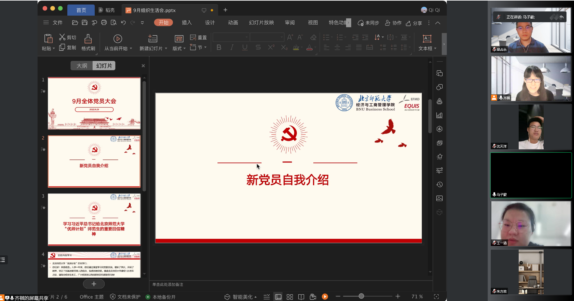 首先,新加入支部的五名党员同志依次做了自我介绍。沈天洋同志和马子豪同志分别是2022级政治经济学和人口资源与环境学博士新生,他们希望未来可以和大家一起学习党的纪律、分享党建生活,互相帮助共同进步。王煜天同志、裴晓强同志和莫建霖同志同是2022级政治经济学硕士新生,表示未来会多参加组织活动,和大家多多交流,为支部做贡献,一同学习理论知识,提高党性修养。