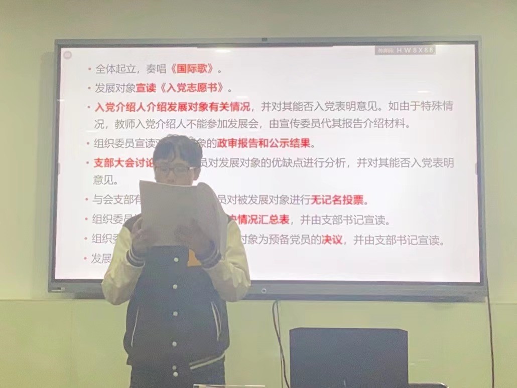 首先,大会依次讨论发展安露露和王彪同志为预备党员事宜。在奏唱《国际歌》后,发展对象上台宣读《入党志愿书》。入党介绍人介绍发展对象的有关情况,并对其能否转为预备党员表明意见。吴俊慧同志宣读发展对象的政审报告及公示结果。随后,支部成员充分讨论了发展对象的优缺点,并对能否发展两位同志为预备党员表明意见。最后,有表决权的正式党员进行无记名投票,宋继龙同志监票,房慧同志计票。本次大会应到会有表决权的正式党员13人,实到会有表决权的正式党员13人,两位发展对象均获得全票赞成。袁胜轩同志宣读了票决汇总表和接收两位同志为预备党员的决议。