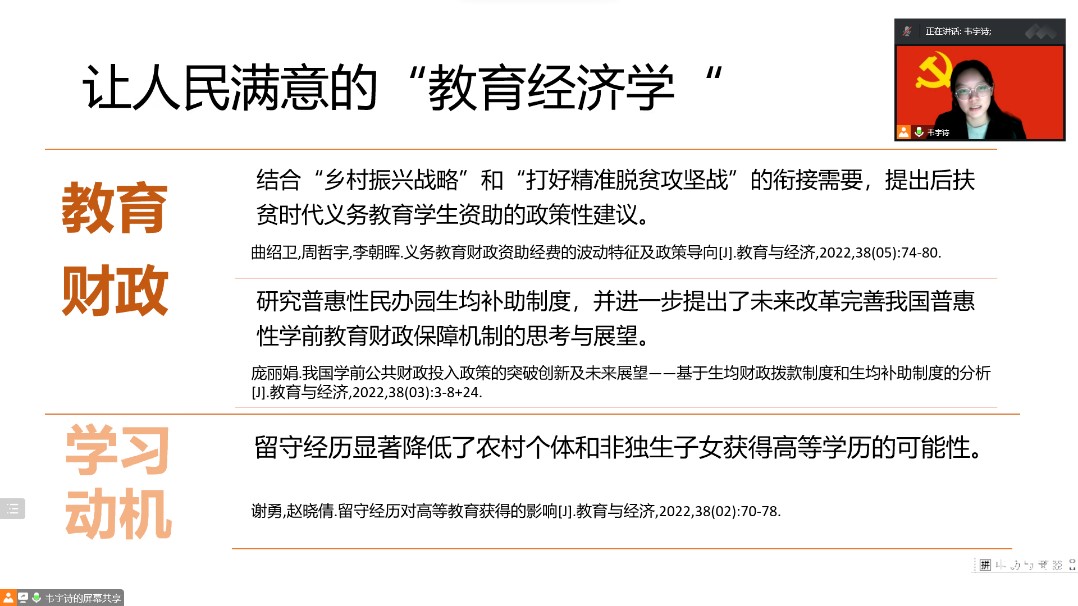 首先,支部成员在韦宇诗的带领下重点学习了党的二十大中关于教育的重要论述。她结合党的二十大报告和统计数据,说明党和国家不仅将教育的战略地位提升到前所未有的高度,还将重视教育落实在具体行动上;同时结合党的二十大代表的光辉事迹和支部成员的专业特点,就作为经济学专业学生如何为教育发展做出贡献提出自己的看法。