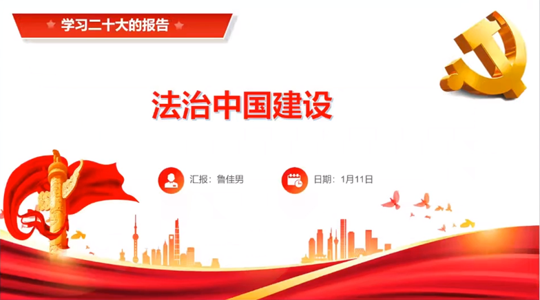 首先,鲁佳男以“法治中国建设”为主题,从完善以宪法为核心的中国特色社会主义法律体系、扎实推进依法行政、严格公正司法、加快建设法治社会四个方面,结合新时代法治建设成就,带领大家继续深入学习了党的二十大精神。多位同学结合自身经历分享了学习体会。大家表示,我国在中国特色社会主义法治道路上取得了众多成就,但仍存在一些问题。大学生要弘扬社会主义法治精神,努力成为社会主义法治的忠实崇尚者、自觉遵守者、坚定捍卫者,进一步提升自身的法治观念。