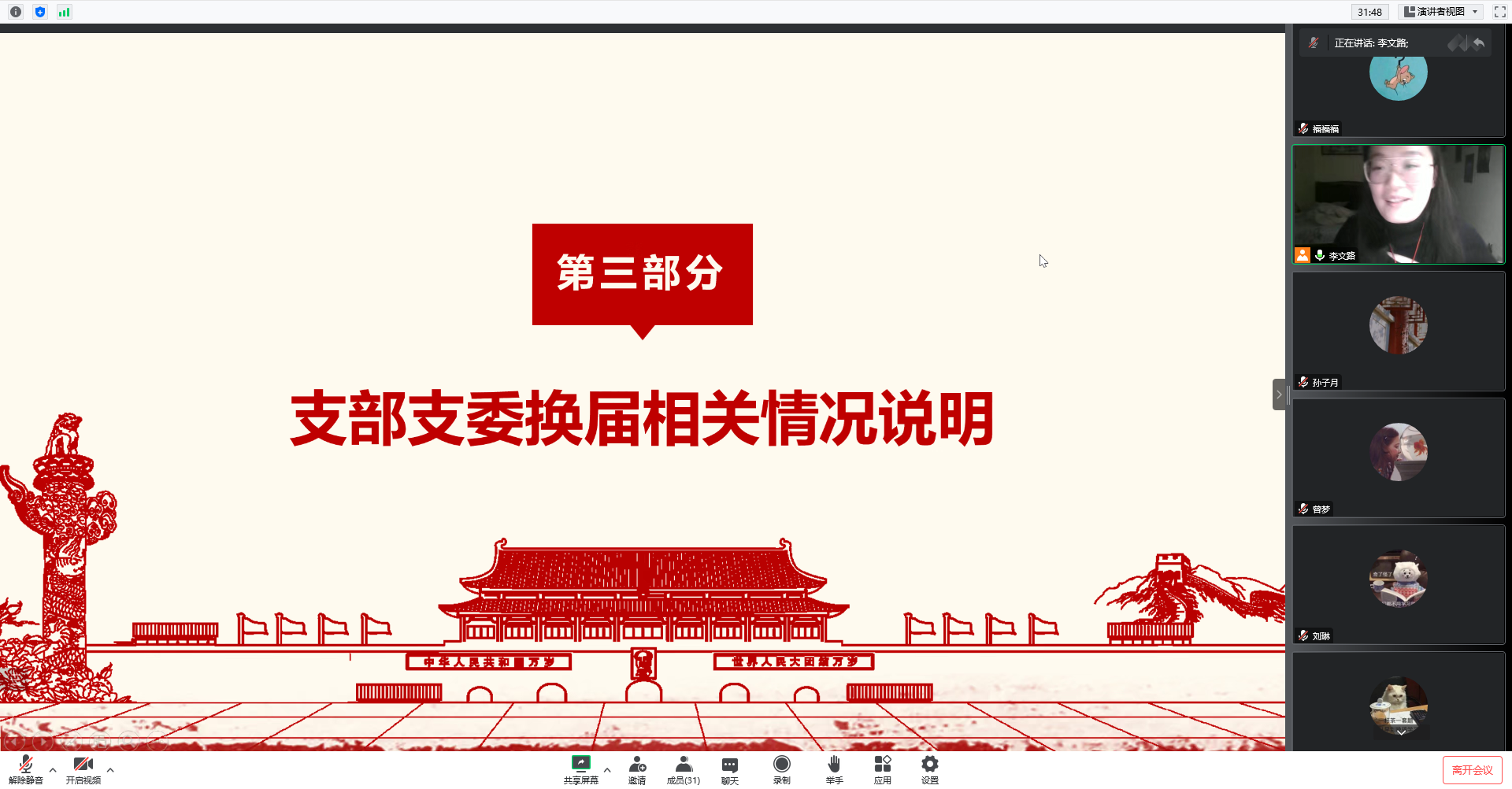 2023年1月29日,潮人论坛 经济学第五党支部于腾讯会议平台召开支部大会,学习习近平主席二〇二三年新年贺词,并进行支委会换届选举。本次会议由支部委员李文路主持。