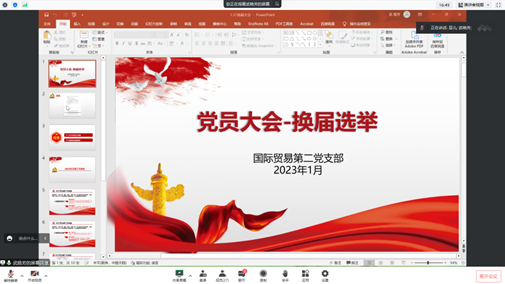 2023年1月31日,潮人论坛 国际贸易第二党支部全体党员线上召开党员大会,进行支部换届选举。会议由党支部书记武艳芳主持。