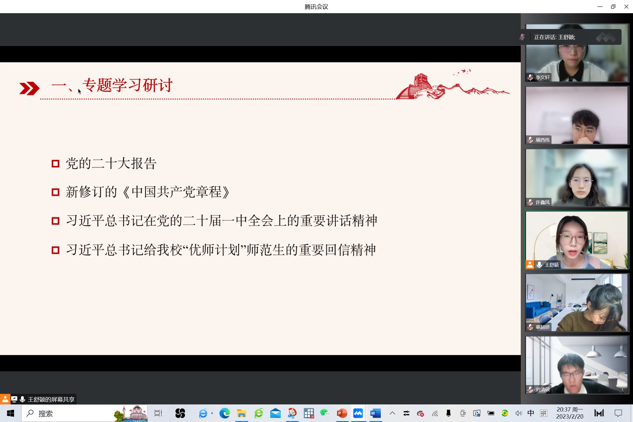 首先,支部全体成员共同回顾了党的二十大报告精神、新修订的《中国共产党章程》、习近平总书记在党的二十届一中全会上的重要讲话精神以及习近平总书记给我校“优师计划”师范生的重要回信精神,进一步加深了党员对党的重要会议和文件精神的理解,提高了党员同志的政治意识、大局意识、核心意识、看齐意识。